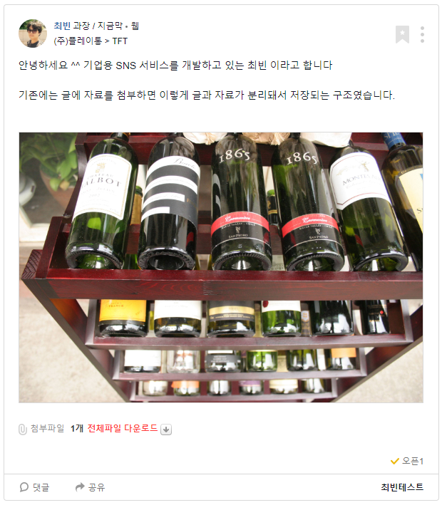 나는 기업용 SNS (이하 SNS) 의 서버개발을 담당하고 있다. 이 SNS에 글을 작성할 때, 이미지, 파일, 투표, 지도, 클라우드 파일(구글드라이브, 드랍박스), 웹페이지 발췌정보를 첨부 할 수 있는데, 기존 구조는 페이스북 처럼 글 따로, 첨부자료 따로 삽입 되는 구조이다. 페이스북이 이런 구조와 동일하다. 이런 구조에서 Band 처럼 본문내 각종 자료를 첨부할 수 있는 구조를 이용하고 싶다는 Needs 가 있어서 이번에 Band 와 같이 본문내 자료를 첨부하는 구조로 변경을 했던 경험을 공유하고자 한다. 기존에는 글 작성중 자료를 첨부하면 아래와 같이 자료 영역에 자료가 삽입되었지만, 밴드처럼 바뀐 구조에서는 글 중간중간 자료가 삽입돼야 하기 때문에 글 작성중 자료 첨부의 구조가 아래와 같이 바..